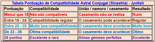 Este teste de pontuação de compatibilidade astral conjugal é muito útil, pois ajuda muito em saber se a união das duas pessoas vai durar muito tempo, pouco tempo, meses, anos ou para a vida toda! A pontução mínima deve ser entre 18 à 21 pontos! A máxima possível, neste teste, é de 36 pontos, algo raríssimo de se ver hoje em dia entre duas pessoas! E neste teste abaixo apareceu DOSHA (problema) nos itens Temeperamento e Amor, o que prejudica em muito a relação destas duas pessoas!