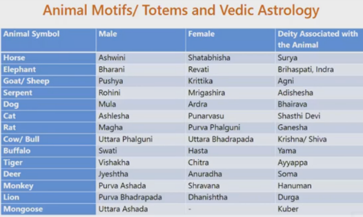 | Ashlesha | Gato | Purva Ashada | Cão |
