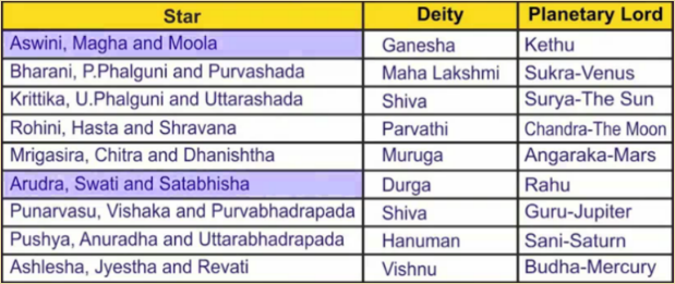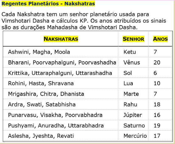 | Revati Nakshatra | Mercúrio | Representa inteligência, comunicação e brilho. Pessoas abençoadas com grande inteligência e habilidade natural de persuadir, aproveitando oportunidades que levam a grande riqueza. |