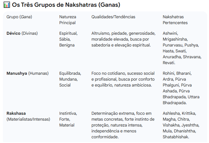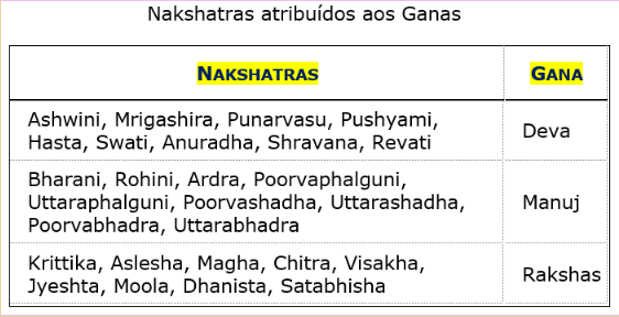 Rakshasa (Materialísticas): Aslesha, Krittika, Magha, Chitra, Vishakha, Jyeshtha, Moola, Dhanishta, Satabisha.