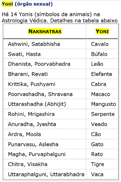 | Nakshatra (Pessoa A) | Yoni (Animal Associado) | Incompatível com (Nakshatra Pessoa B) | Yoni Inimigo (Animal) |