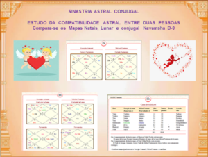 A SINASTRIA ASTRAL CONJUGAL utiliza de várias ferramentas e Mapas de comparação das personalidades: Mapa Astral Natal, Mapa Astral Solar, Mapa Lunar, Navamsha D-9 Conjugal, Mapa Composto, etc.!